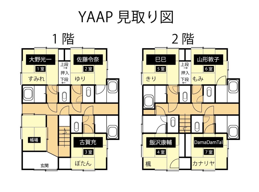 YAAPロゴはDamaDamTalのみきたまきさんがデザインしました。各部屋が四畳半の部屋で、そこから広がる未知の世界をイメージして畳を元にデザインされています。